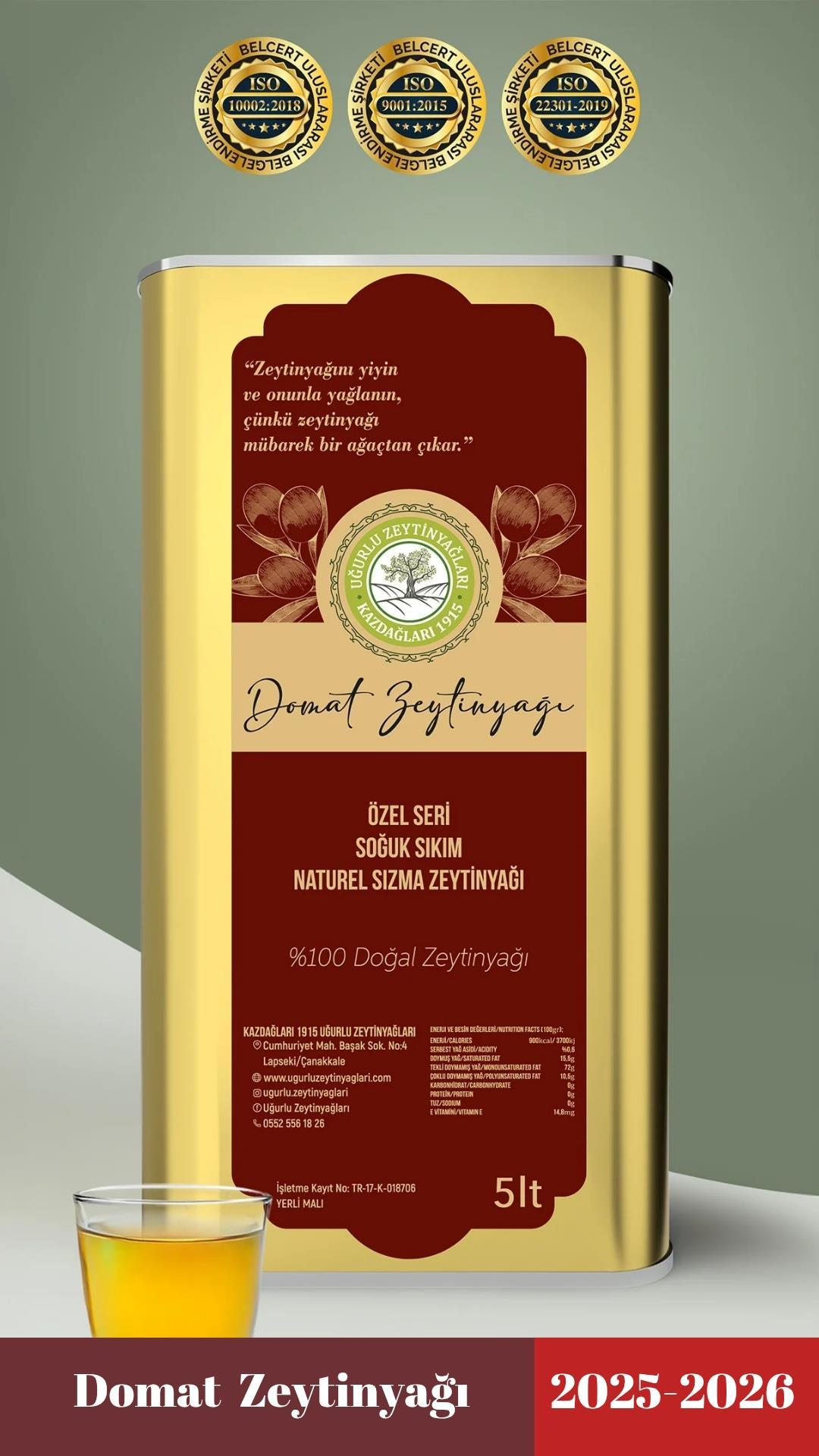 Geleneksel Tarım Yöntemleri ile İlaçsız Olarak Yetiştirilen Domat Erken Hasat Zeytinlerden 22°C Soğuk Sıkım Yöntemiyle Üretilen, 01-05 Dizem, Yüksek Polifenol Değerlere Sahip 1. Kalite Domat Zeytinyağımız.Kahvaltı, Salatalar Ve Yemekler de Dilediğiniz Gibi Tüketebileceğiniz Yoğun Aromalı Bu Lezzeti Şimdi Sipariş Ver!